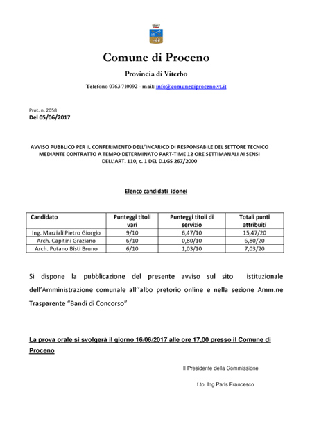 Avviso pubblico per il conferimento dell'incarico di Responsabile del Settore Tecnico mediante contratto a tempo determinato part-time 12 ore settimanali ai sensi dell'art. 110, c. 1 del D.Lgs 267/2000 - Elenco candidati idonei