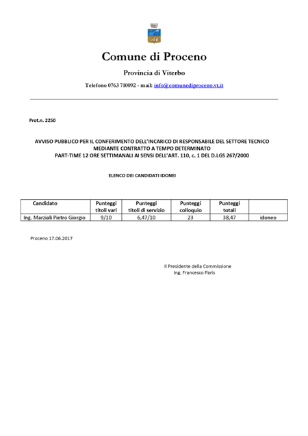 Avviso pubblico per il conferimento dell'incarico di Responsabile del Settore Tecnico mediante contratto a tempo determinato part-time 12 ore settimanali ai sensi dell'art. 110, c. 1 del D.Lgs 267/2000 - Elenco dei candidati idonei